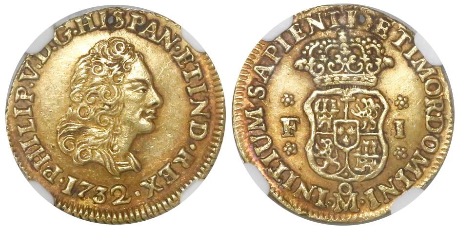 Mexico City, Mexico, bust 1 escudo, Philip V, 1732F, very rare, NGC AU details / holed. CT-unl; KM-113. Deeply and beautifully red-toned with bold details all over, slightly off-center strike, with tiny hole at top the only aspect keeping this important first-year issue from the five-figure level. NGC #3735672-001.