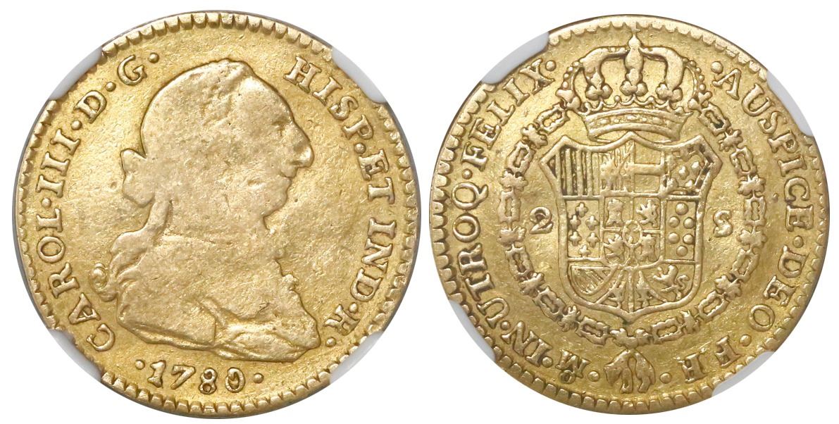 Mexico City, Mexico, bust 2 escudos, Charles III, 1780FF, NGC Fine details / damaged. CT-483; KM-130.2. Good details for the grade, with weakness and wear on bust but no obvious damage as stated.