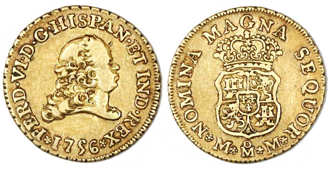 Mexico City, Mexico, bust 2 escudos, Ferdinand VI, 1756MM. CT-167; KM-126.2. 6.71 grams. Problem-free XF with nice toning, high-point wear only (especially on the bust), very scarce.