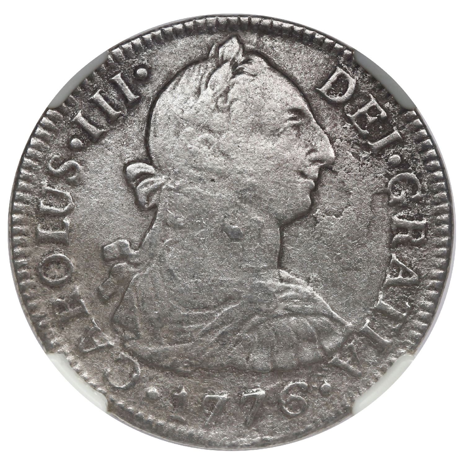 Mexico City, Mexico, bust 2 reales, Charles III, 1776 FM, NGC genuine / El Cazador Shipwreck Label. Yonaka-; KM-88.2; Cal-662. Desirable date of US independence on this coin recovered from the shipwreck that is said to have changed American history by influencing the eventual sale of the Louisiana Purchase to the United States. Bold obverse details with full bust and clear date, reverse more corroded yet with plenty of detail. Recovered from: Cazador, sunk in 1784 off New Orleans, Louisiana