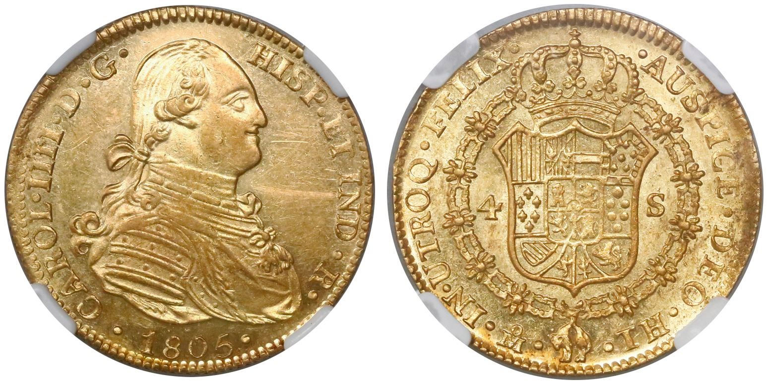 Mexico City, Mexico, bust 4 escudos, Charles IV, 1805TH, encapsulated NGC AU 55, finest known in NGC census by three grades. CT-226; KM-144. An exceptional specimen, fully lustrous, well struck and problem-free (clearly MS in our opinion but in a very critically graded series with very few MS coins on record among all the dates). NGC #2782189-011.
