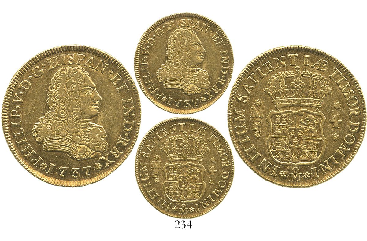 Mexico City, Mexico, bust 4 escudos, Philip V, 1737MF. KM-135; CT-243. 13.4 grams. Lustrous AU with nice old toning, nice strike except for high points of hair, a choice and problem-free example of a scarce early type.