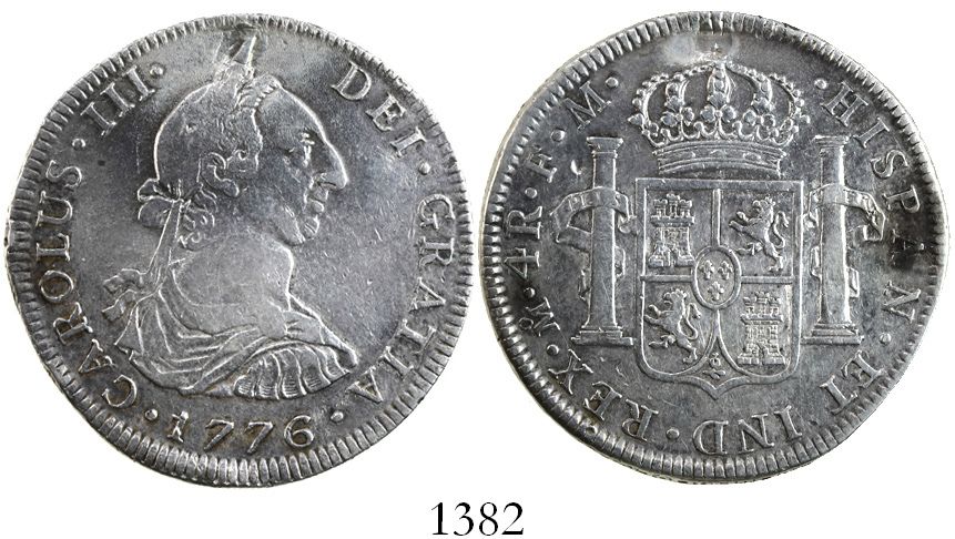 Mexico City, Mexico, bust 4 reales, Charles III, 1776FM, popular date. KM-97.2; CT-1138. 13.32 grams. Cleaned VF with plugged hole at top, broad flan but somewhat crude (as made) around rims.