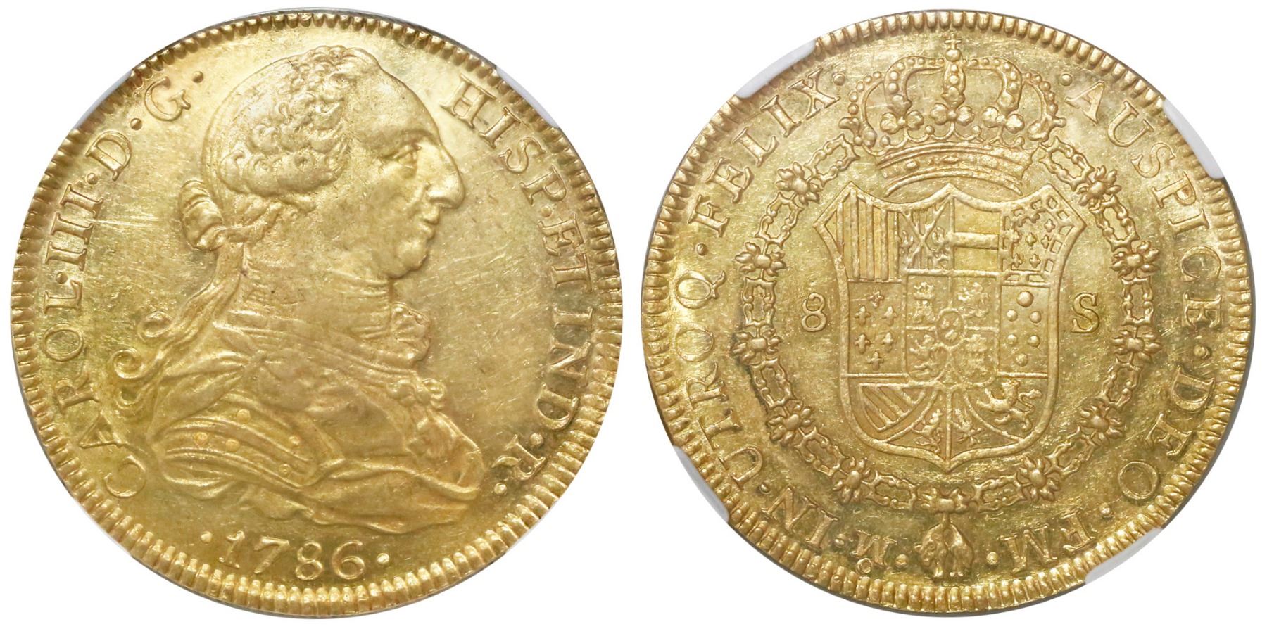 Mexico City, Mexico, bust 8 escudos, Charles III, 1786FM, NGC MS 61, tied for finest known in NGC census. CT-110; KM-156.2a. Bold strike with lovely luster, minor marks only. NGC #3932750-015.