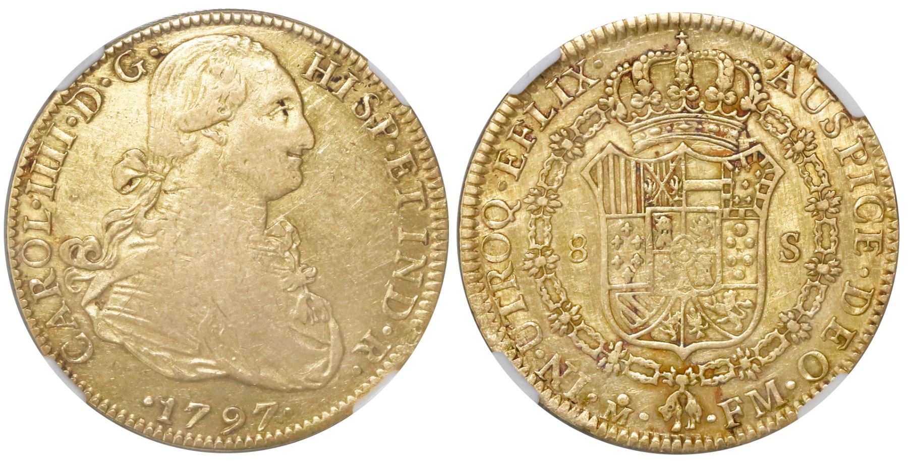 Mexico City, Mexico, bust 8 escudos, Charles IV, 1797FM, "EFLIX" error (rare), NGC VF details / excessive surface hairlines. CT-48; KM-159. With luster and toning around details but hairlined all over from improper cleaning, still among the finest known of this rare error ("top pop" in NGC census). NGC #3735677-013.