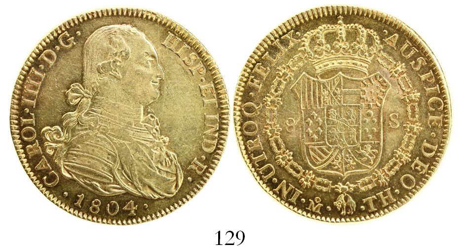 Mexico City, Mexico, bust 8 escudos, Charles IV, 1804TH. CT-59; KM-159. 26.97 grams. Lustrous AU/UNC with minor marks in obverse fields, starting to tone.
