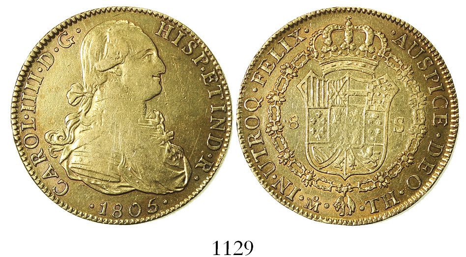 Mexico City, Mexico, bust 8 escudos, Charles IV, 1805TH. KM-159; CT-60. 26.89 grams. AXF with weak centers, nice red toning in legends, lustrous as probably lightly polished in its past.