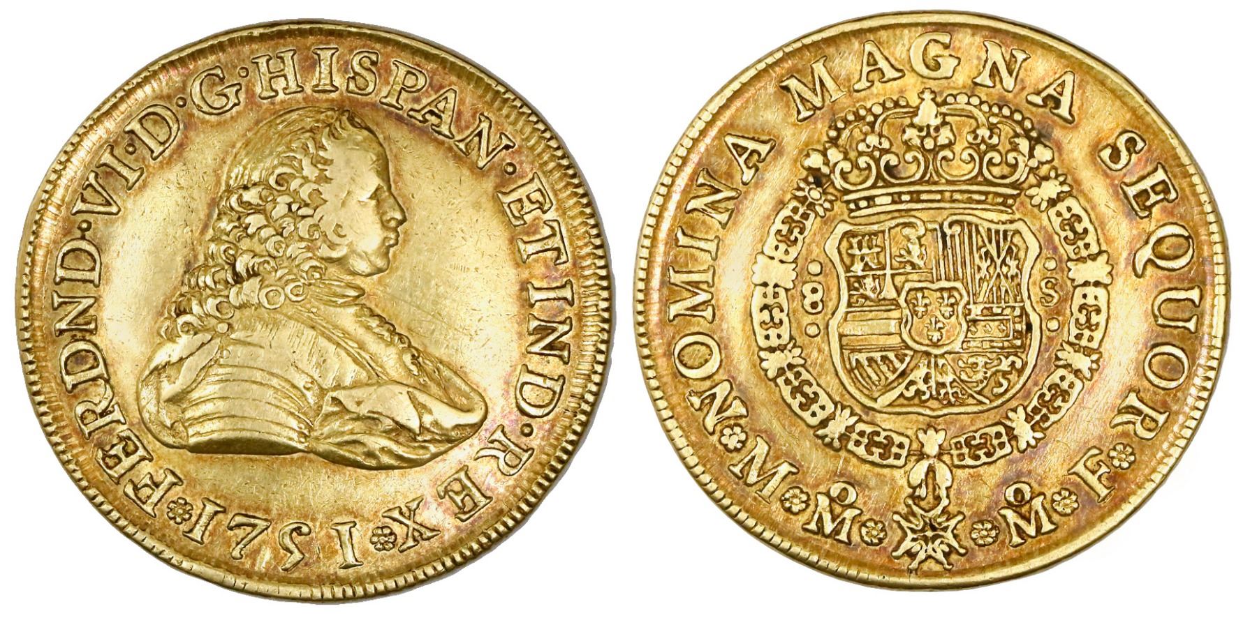 Mexico City, Mexico, bust 8 escudos, Ferdinand VI, 1751MF. CT-39; KM-150. 26.94 grams. Bold XF with purple toning around details, minor marks, scarce date.