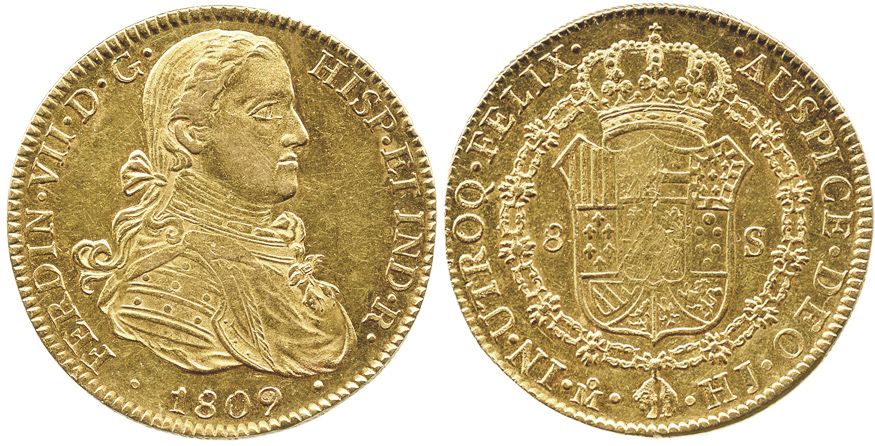 Mexico City, Mexico, bust 8 escudos, Ferdinand VII transitional ("armored bust"), 1809HJ.