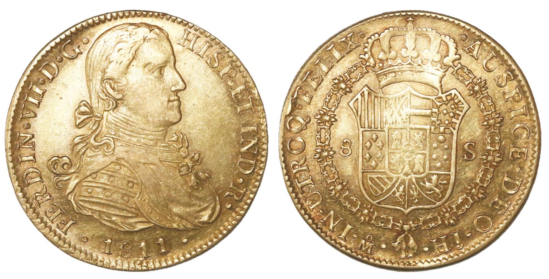 Mexico City, Mexico, bust 8 escudos, Ferdinand VII transitional ("armored" bust), 1811/0HJ.