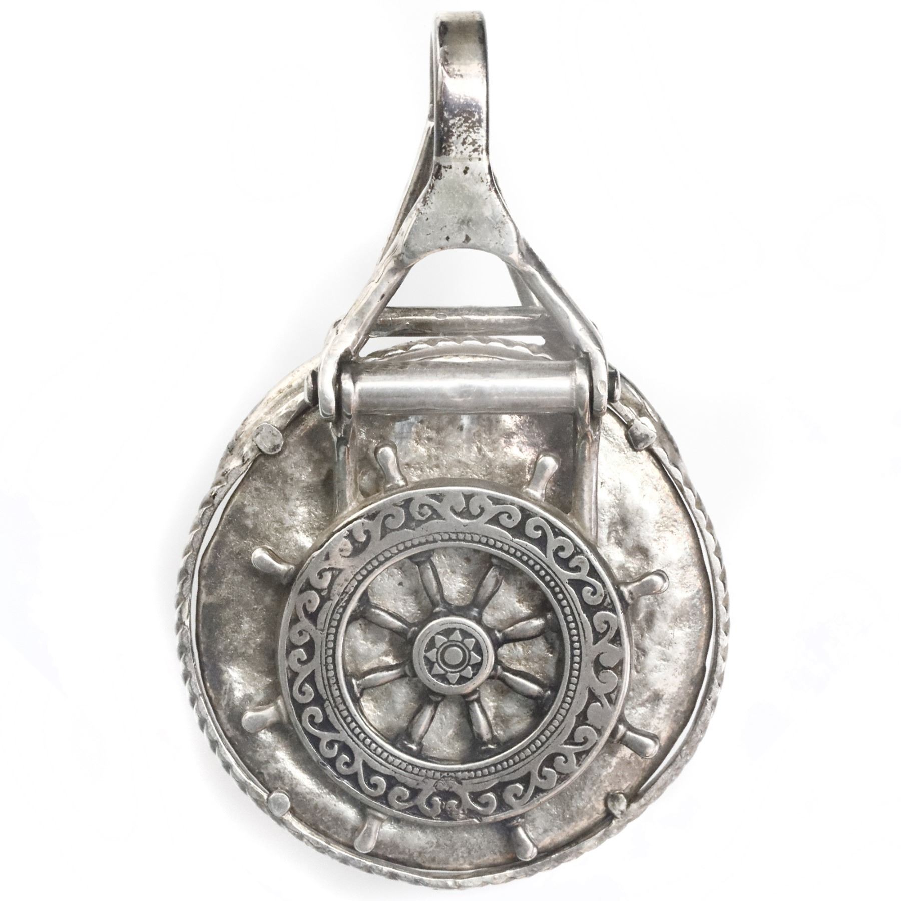 Mexico City, Mexico, bust 8 reales, 1783FF, ex-Cazador (1784), mounted in fancy silver money clip. 41.89 grams total. A one-sided coin with full VF bust side and smoothly corroded reverse, contour-mounted in reeded-edge bezel that is open-V mounted to a hinged back in the form of a ship's wheel with ornate ring, well used but fully functional, definitely a good conversation piece. From the Cazador (1784), with photo-certificate.
