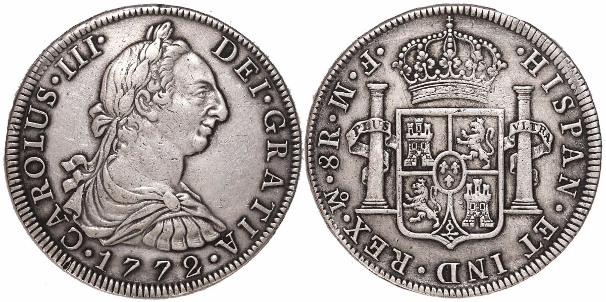 Mexico City, Mexico, bust 8 reales, Charles III, 1772FM, initials facing rim. 26.97 grams. Bold VF with dark toning around details, good rims.