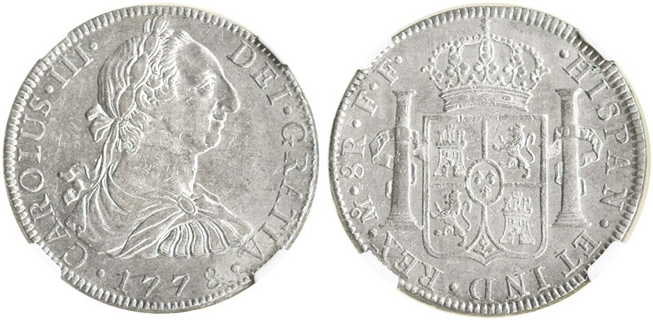 Mexico City, Mexico, bust 8 reales, Charles III, 1778FF, encapsulated NGC AU 55. KM-106.2; CT-926. Very lightly toned with underlying luster, minor bagmarks on fields.