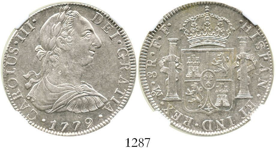 Mexico City, Mexico, bust 8 reales, Charles III, 1779FF, encapsulated NGC AU 58. KM-106.2; CT-929. Choice strike and somewhat prooflike (highly lustrous, just too many hairlines to make Mint State.