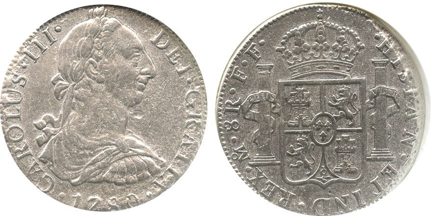 Mexico City, Mexico, bust 8 reales, Charles III, 1780FF, encapsulated NGC Genuine (name of wreck stated inside slab). KM-106.2; CT-930. Typically silvery and corroded around the edge, otherwise XF+. Recovered from: Cazador, sunk in 1783 off New Orleans