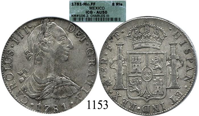 Mexico City, Mexico, bust 8 reales, Charles III, 1781FF, encapsulated ICG-AU50. KM-106.2. Nice XF+, lightly brown-toned here and there, no problems.