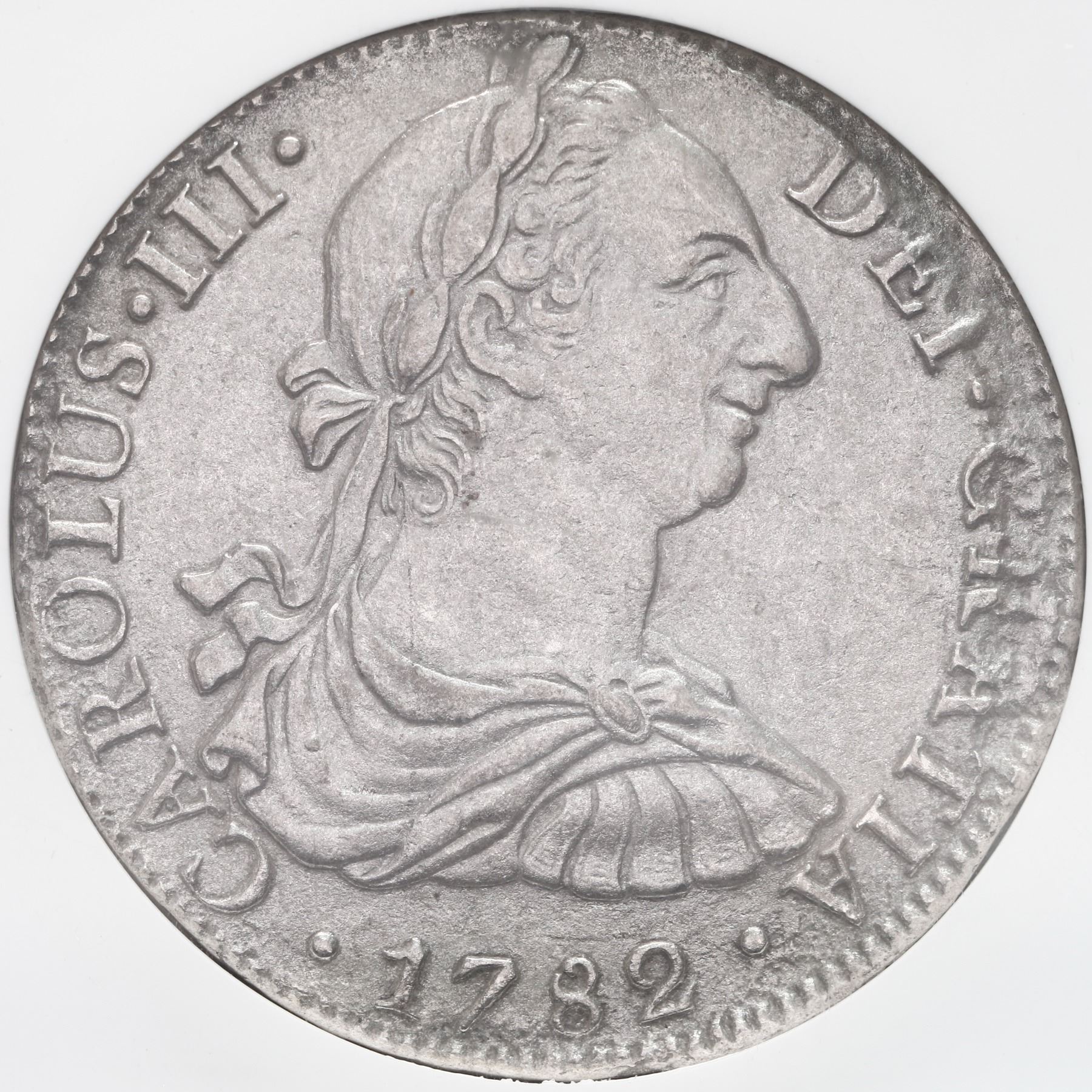 Mexico City, Mexico, bust 8 reales, Charles III, 1782 FF, NGC genuine / El Cazador shipwreck label.