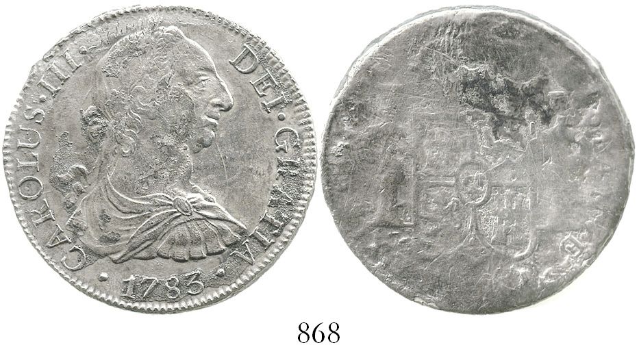 Mexico City, Mexico, bust 8 reales, Charles III, 1783FF. KM-106.2; CT-933. 22.1 grams. Bold and well-detailed (XF) bust side (also nicely toned), the reverse heavily corroded and polished. With photo-certificate. Recovered from: Cazador, sunk in 1784 off New Orleans