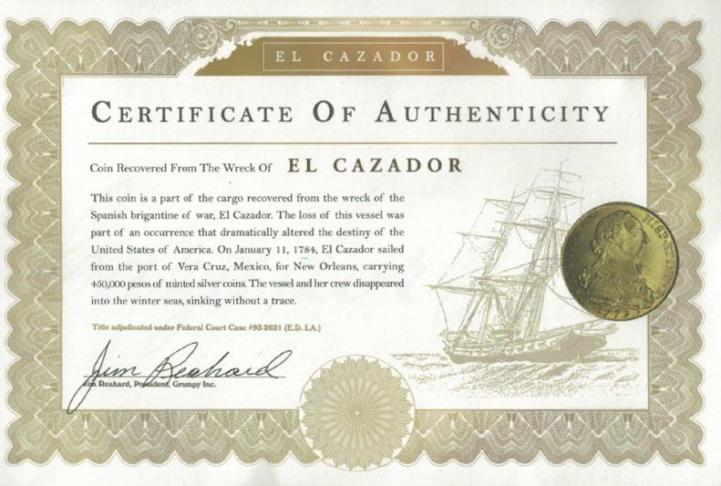 Mexico City, Mexico, bust 8 reales, Charles III, 1783FF. Yonaka-M8-83; KM-106.2; Cal-1124. 24.61 grams. UNC details with traces of luster, practically no corrosion, spots of faint golden toning. With original (generic) certificate from the salvagers.Recovered from: Cazador, sunk in 1784 off New Orleans, Louisiana