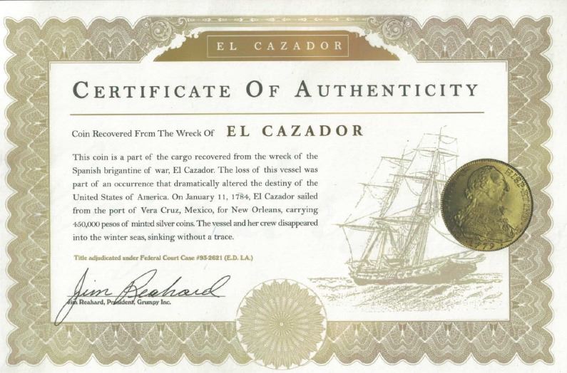 Mexico City, Mexico, bust 8 reales, Charles III, 1783FF. Yonaka-M8-83; KM-106.2; Cal-1124. 25.35 grams. Choice AU details with traces of luster, practically no corrosion, spots of faint golden toning. With original (generic) certificate from the salvagers.Recovered from: Cazador, sunk in 1784 off New Orleans, Louisiana