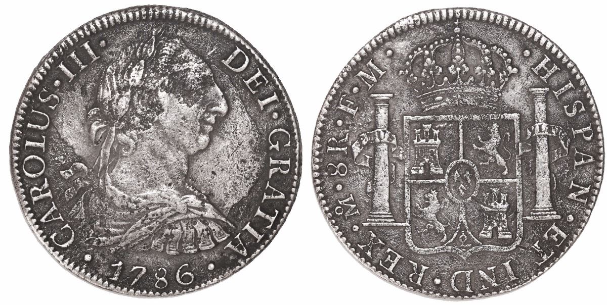 Mexico City, Mexico, bust 8 reales, Charles III, 1786FM. 24.61 grams. Nicely toned, XF details with very light surface corrosion only, the rims particularly bold. Pedigreed to the Thomas Gray collection and formerly displayed at the ANA Money Museum's "Treasures of the Deep" exhibit (2014-15), also pedigreed to our Auction #11, with original lot-tag #591 and certificate from the salvager (Robert Stenuit). Recovered from: Athenienne, sunk in 1806 off Sicily in the Mediterranean