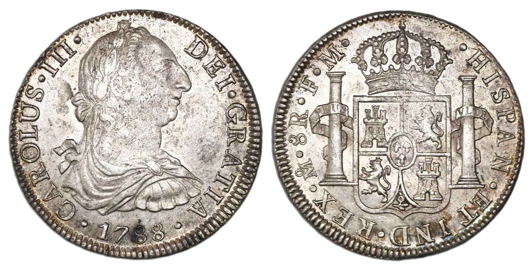 Mexico City, Mexico, bust 8 reales, Charles III, 1788FM. KM-106.2a; CT-942. 26.93 grams. AU with light toning over ample luster, light surface hairlines, slightly off-center strike.