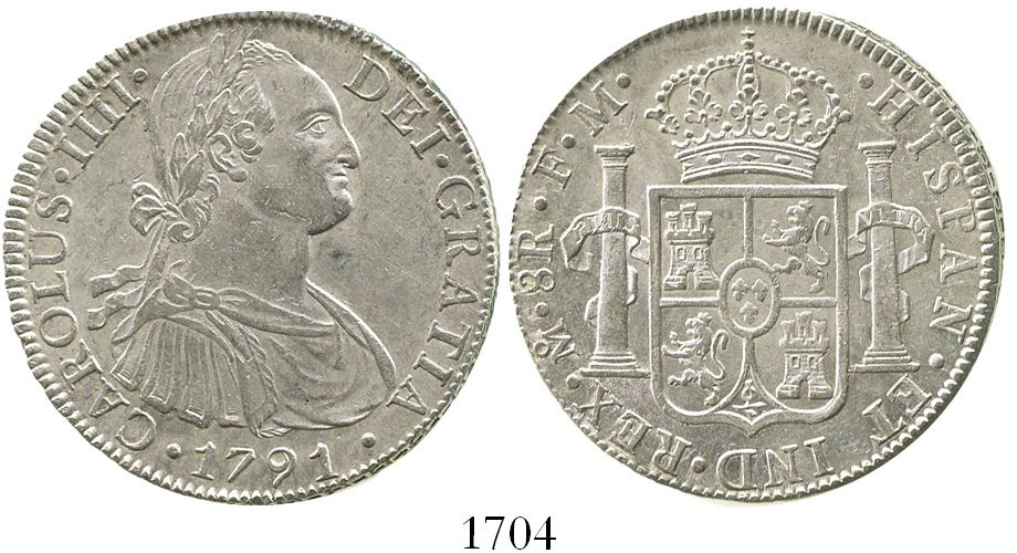 Mexico City, Mexico, bust 8 reales, Charles IV, 1791FM.