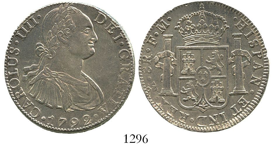 Mexico City, Mexico, bust 8 reales, Charles IV, 1792FM. KM-109; CT-685. 26.9 grams. Lustrous AU-, no toning, good strike.