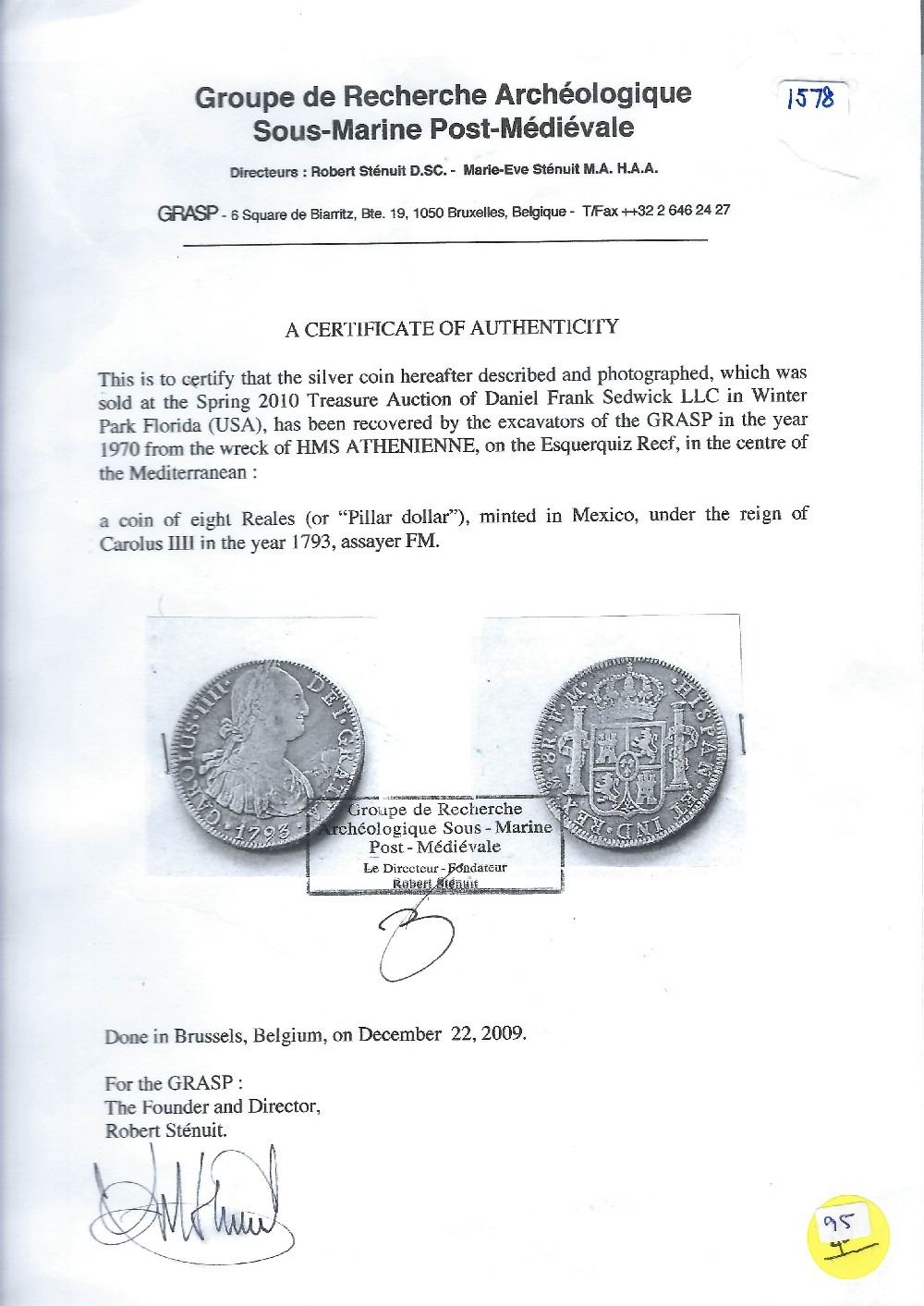 Mexico City, Mexico, bust 8 reales, Charles IV, 1793FM. KM-109; Cal-955. 25.64 grams. Bold VF details, very light surface corrosion, deeply toned all over, scarce provenance. With original photo-certificate from the salvor (Stenuit). From: Athenienne, sunk in 1806 off Sicily in the Mediterranean