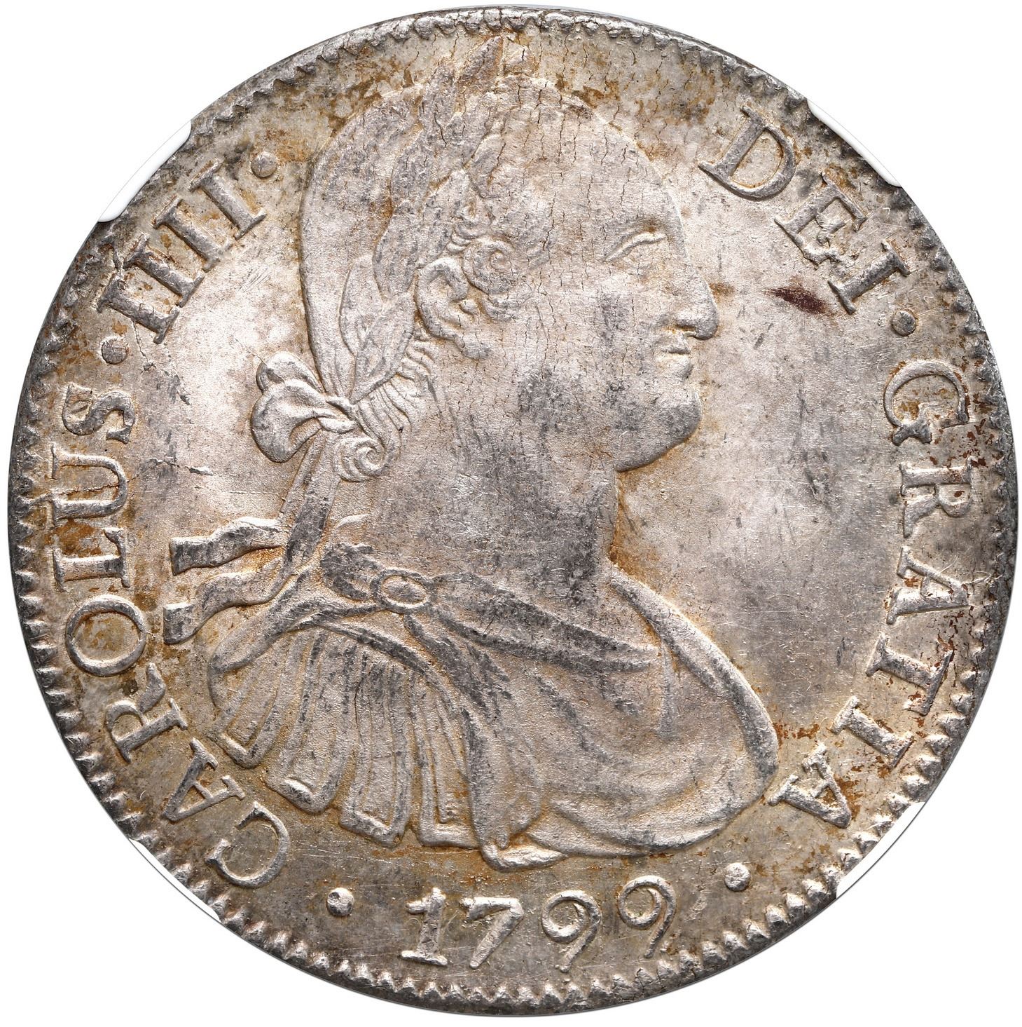 Mexico City, Mexico, bust 8 reales, Charles IV, 1799 FM, NGC MS 63 ("top pop"). Yonaka-M8.99; KM-109; Cal-963. Muted luster under light rainbow toning, no wear at all, the strike a bit soft and low in contrast, currently tied with one other for finest in NGC census.