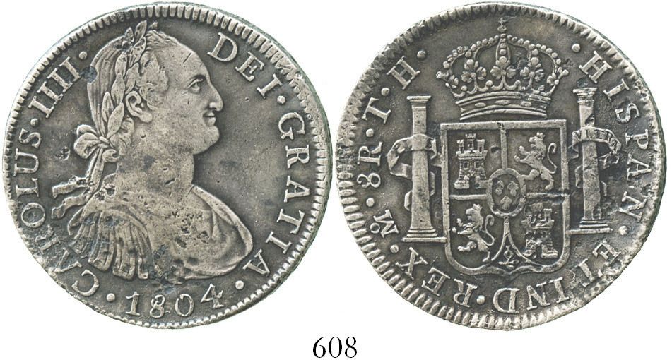 Mexico City, Mexico, bust 8 reales, Charles IV, 1804TH. KM-109; CT-701. 26.6 grams. Choice specimen with beautiful details, a few small marks but no outright corrosion, attractively toned. With certificate from the salvager (Stenuit). From the Athenienne, sunk in 1806 off Sicily in the Mediterranean