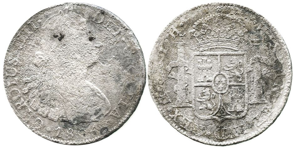 Mexico City, Mexico, bust 8 reales, Charles IV, 1804TH. KM-109; CT-701. 23.0 grams. Typical moderate surface corrosion but clear details, very lightly toned (with some spots), minimal contrast. With Fisher photo-certificate #22144. Recovered from: "1810 wreck," sunk in 1810 off Ft. Pierce, Florida