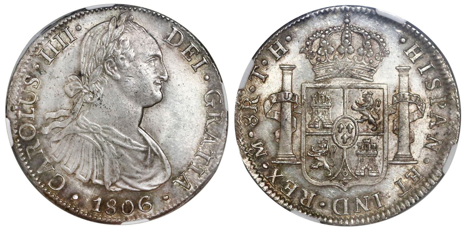 Mexico City, Mexico, bust 8 reales, Charles IV, 1806TH, NGC MS 62. KM-109; CT-705. Bold strike, very light toning around details, muted luster, light adjustment marks on crown. NGC #4465607-007.