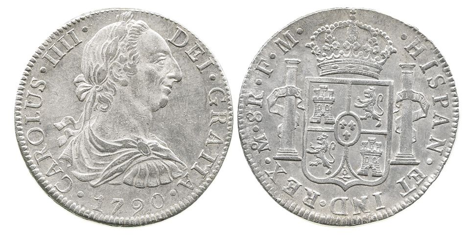 Mexico City, Mexico, bust 8 reales, Charles IV transitional (bust of Charles III, ordinal IIII), 1790FM. KM-107; CT-682. 26.9 grams. Well-detailed strike and much luster, faint adjustment marks on reverse, a couple minor rim-flaws and surface spots, AU with bagmarks.