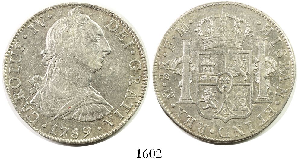 Mexico City, Mexico, bust 8 reales, Charles IV transitional (bust of Charles III, ordinal IV), 1789FM. KM-107; CT-681. 26.89 grams. Flashy (lustrous) AU with light marks and surface hairlines, die-crack across center of reverse.