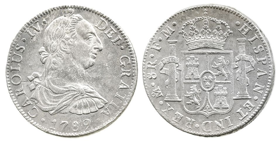 Mexico City, Mexico, bust 8 reales, Charles IV transitional (bust of Charles III, ordinal IV), 1789FM. KM-107; CT-681. 26.9 grams. Nice AU with luster, incipient toning, minor bagmarks.
