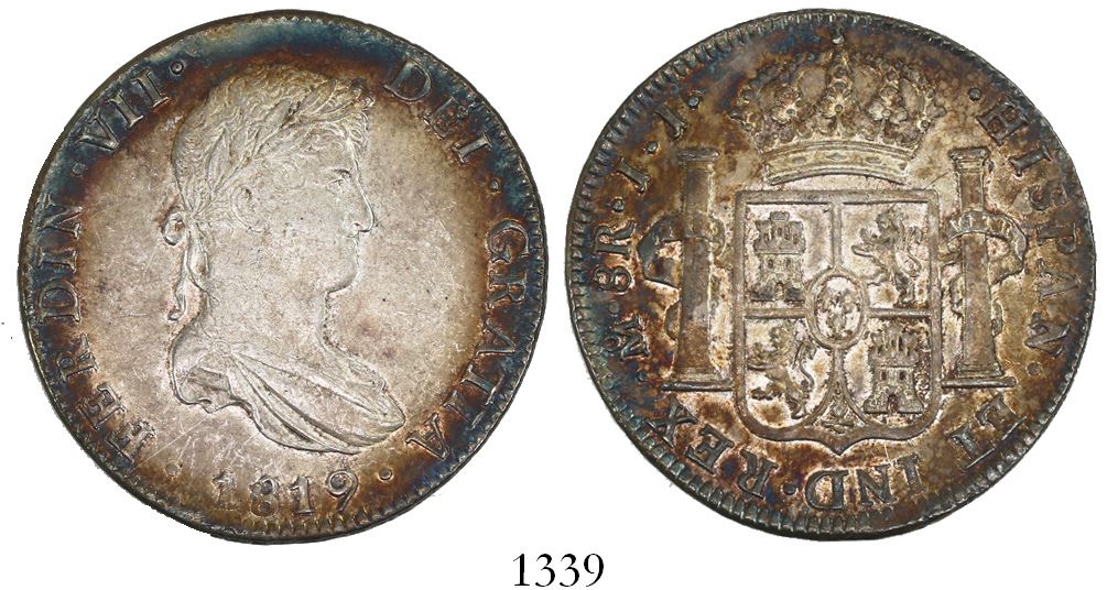 Mexico City, Mexico, bust 8 reales, Ferdinand VII, 1819JJ. KM-111; CT-563. 26.99 grams. Choice strike, UNC with rainbow toning over muted luster around rims, faint staple-scratch on obverse.