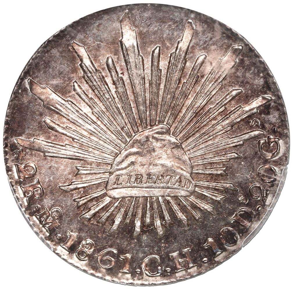 Mexico City, Mexico, cap-and-rays 2 reales, 1861 CH, PCGS MS64+. KM-374.10. Lightly rainbow toned over cartwheel luster, choice strike with curious fiber strike-through around eleven o'clock on cap-and-rays side.