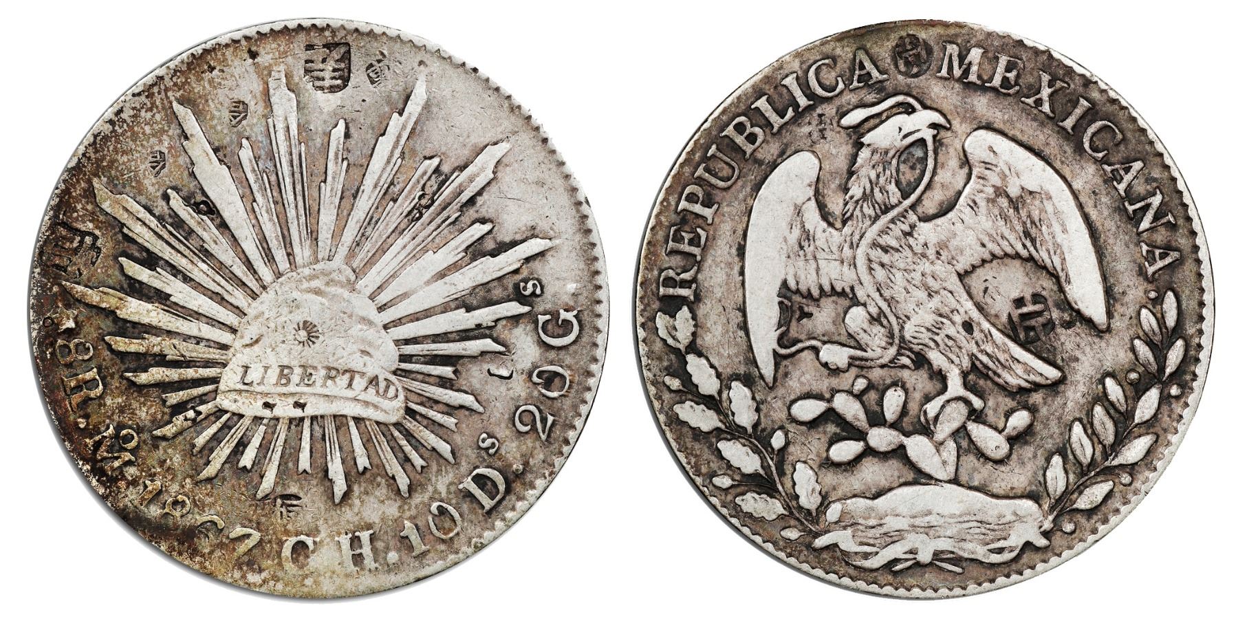 Mexico City, Mexico, cap-and-rays 8 reales, 1867CH/TH, with chopmarks as from circulation in Asia, P
