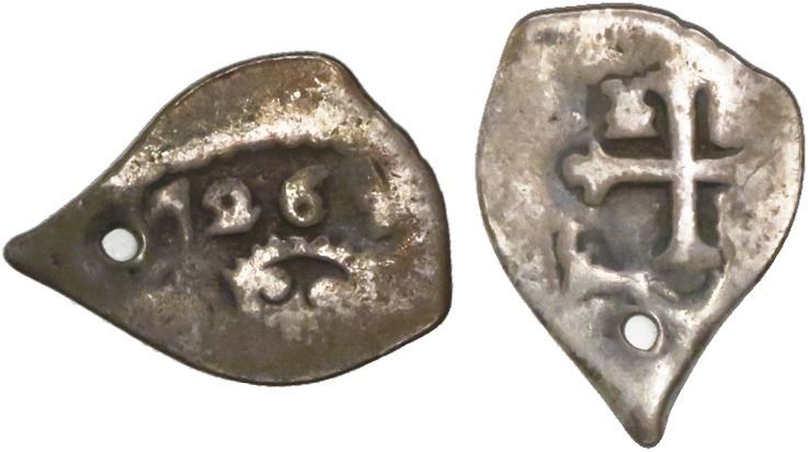 Mexico City, Mexico, cob 1/2 real, (1)726(D), rare. S-M23a; KM-24; CT-unl (Type 286). 1.26 grams. Tiny teardrop flan with very bold full 726 of date, nearly full cross, toned Fine with hole in point.