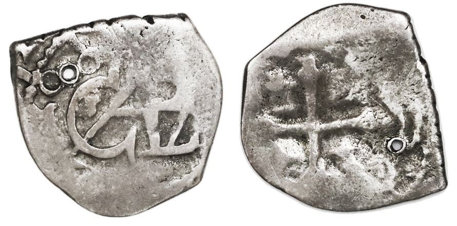 Mexico City, Mexico, cob 1/2 real, (16)72(G), very rare. S-M20; KM-23 for type; Cal-unl. 1.79 grams. Clear bottom half of 72 of date, full monogram and cross, lightly toned, but only VG for wear and with tiny hole near edge.