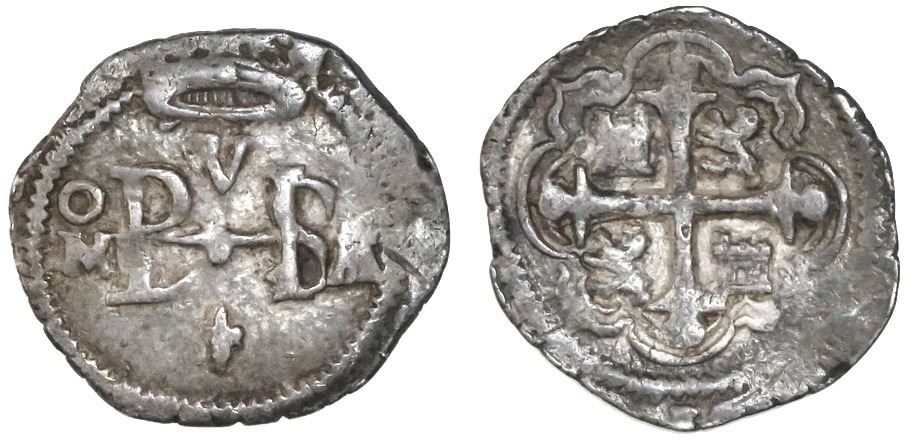 Mexico City, Mexico, cob 1/2 real, Philip III, assayer A/F (1608-9), rare, ex-Christensen. S-M16. 1.65 grams. Choice full monogram with bold oM to left and fleur below, weaker but certain A/F to right, choice full cross, XF+ with nice old toning, desirable pedigree. With original Henry Christensen tag.