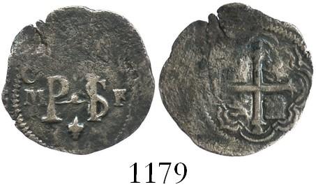 Mexico City, Mexico, cob 1/2 real, Philip III, assayer F. S-M15. 1.4 grams. Broad flan with choice full monogram, bold oM to left and F to right, fleur below, also decent cross, toned VF that may have been salvaged.