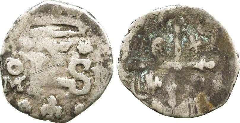Mexico City, Mexico, cob 1/2 real, Philip IV, assayer P. S-M19. 1.7 grams. Bold oM to left and weak P to right of full but mostly flat monogram, with bold fleur-de-lis below, full but unevenly toned cross, Fine.