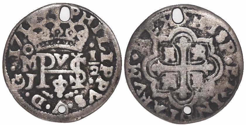 Mexico City, Mexico, cob 1/2 real Royal, 1716J. 1.72 grams. Deeply toned AVF with typically full and bold details but last digit of date slightly weak (possibly 7/6 or some other overdate), holed twice (top and bottom).