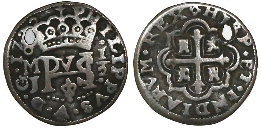 Mexico City, Mexico, cob 1/2 real Royal, 1722J, rare. S-M22; KM-R24; CT-1810. 1.36 grams. Richly toned AVF with crude hole below date / 2 o'clock on reverse (aligned axis).