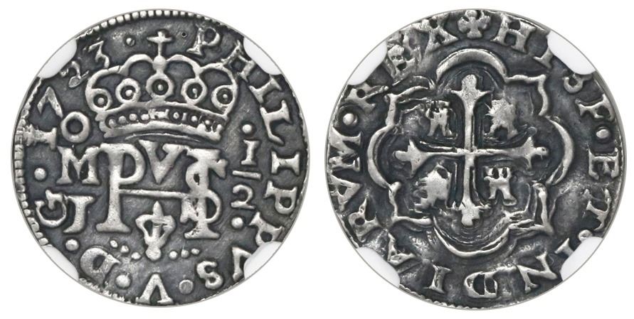 Mexico City, Mexico, cob 1/2 real Royal, 1723J, rare, NGC XF details / plugged. S-M22; KM-unl (R24 for Type); CT-1811. 1.7 grams. Full and choice details with attractive toning all over, the plugged hole at top (where a punchmark appears) virtually undetectable. Pedigreed to our Auction #18 (lot #533).