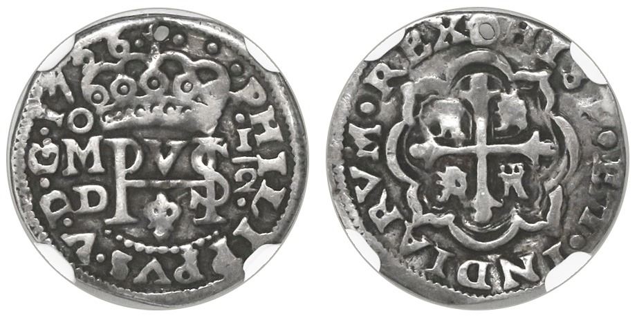 Mexico City, Mexico, cob 1/2 real Royal, 1726D, rare, NGC VF details / holed. S-M23a; KM-R24; CT-unl (285 for Type). 1.65 grams. Full details, attractively toned, the hole at top tiny. Pedigreed to our Auction #18 (lot #536).