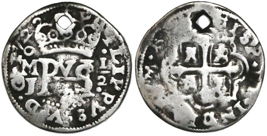 Mexico City, Mexico, cob 1/2 real Royal (galano), 1722J, rare. S-M22; KM-unl. 1.36 grams. AVF with some areas of weak strike, mostly toned fields, usual hole at top.