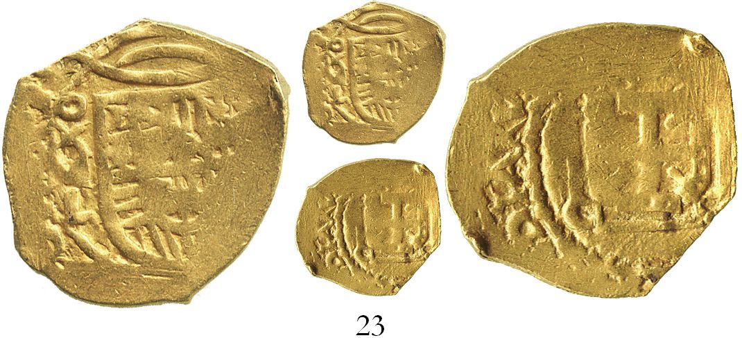 Mexico City, Mexico, cob 1 escudo, (169)7L, jeweled cross, from the 1715 Fleet, very rare. S-M29; KM-50; CT-190. 3.4 grams. Bold oXML, nearly full 7 of date, most of cross and shield despite flatness from typically crude strike, VF with blunted points around edge (as made). From the 1715 Fleet.